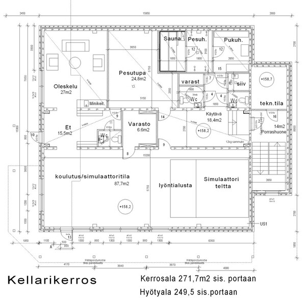 16 huonetta, klubitila, kokoustila, pesutupa, saunaosasto, tekninen tila, 692.9 m²,